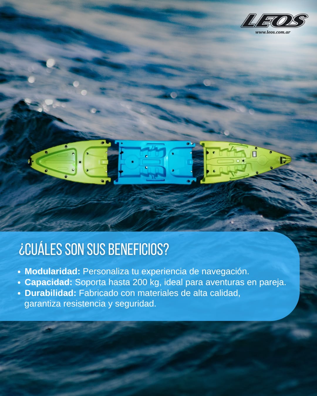 Este kayak consta de 3 módulos independientes, que se ensambla uno con otro logrando una capacidad para 2 personas. Obteniendo la ventaja que el usuario puede hacer uso del mismo según la necesidad del momento, usándolo en forma simple o doble.