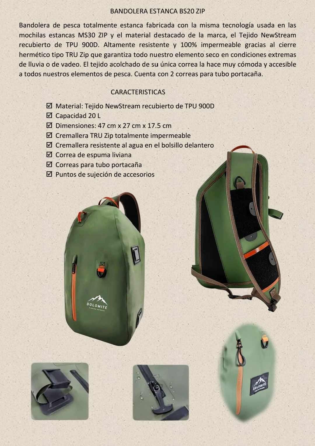 Bandolera de pesca totalmente estanca fabricada con el material destacado de la marca, el Tejido NewStream recubierto de TPU 900D. Altamente resistente e impermeable gracias al cierre hermético tipo TRU Zip que garantiza todo nuestro elemento seco en condiciones extremas de lluvia o de vadeo. El tejido acolchado de su única correa la hace muy cómoda y accesible a todos nuestros elementos de pesca. Cuenta con 2 correas para tubo portacaña.