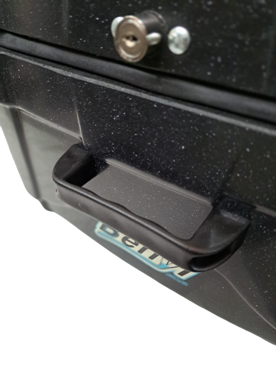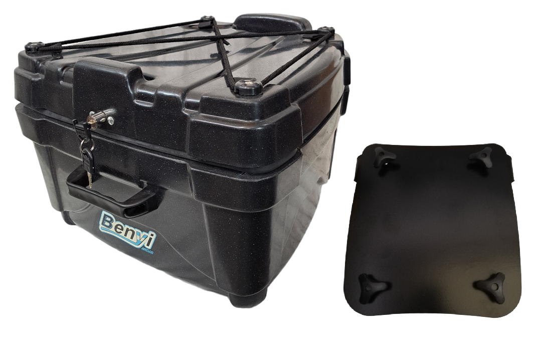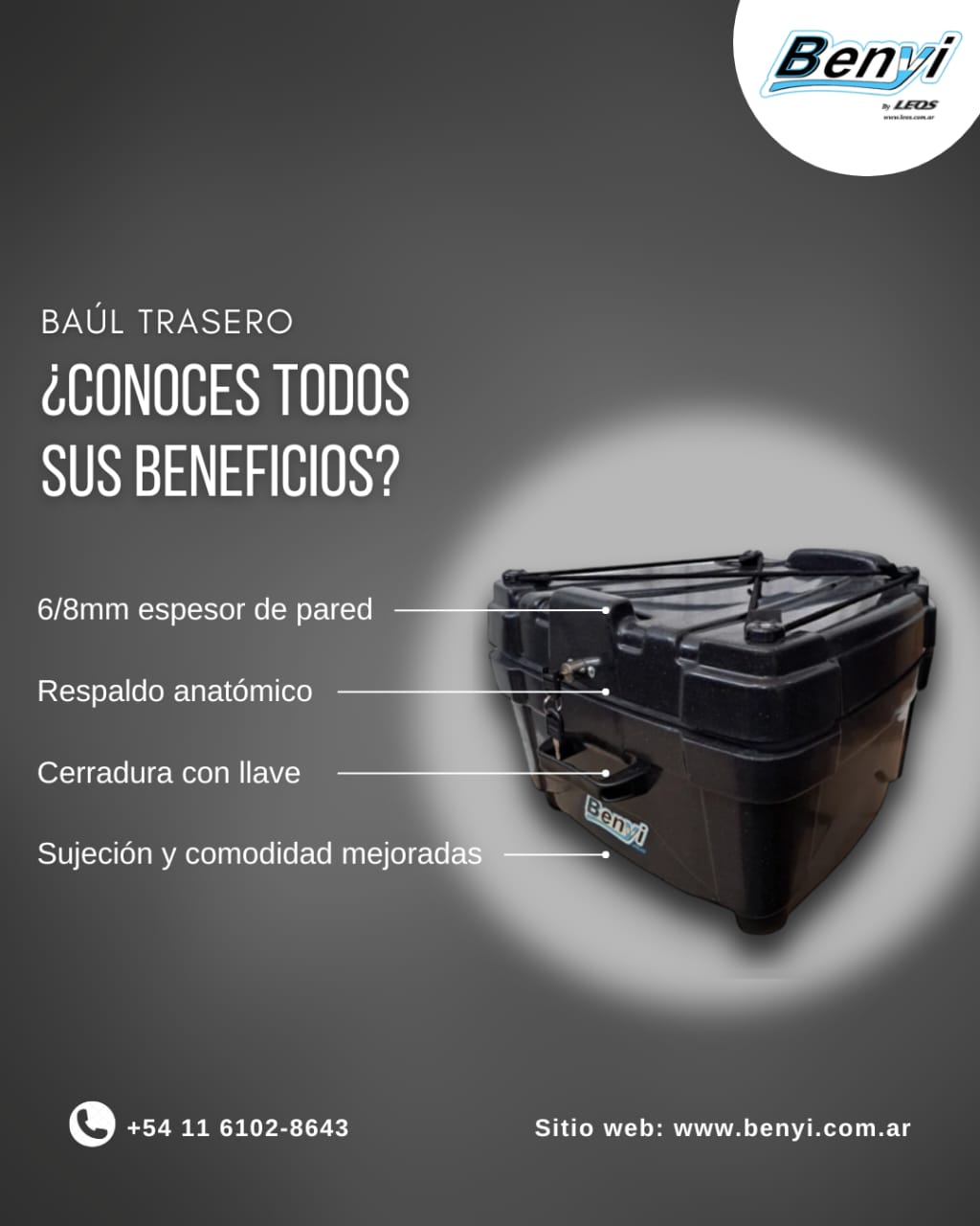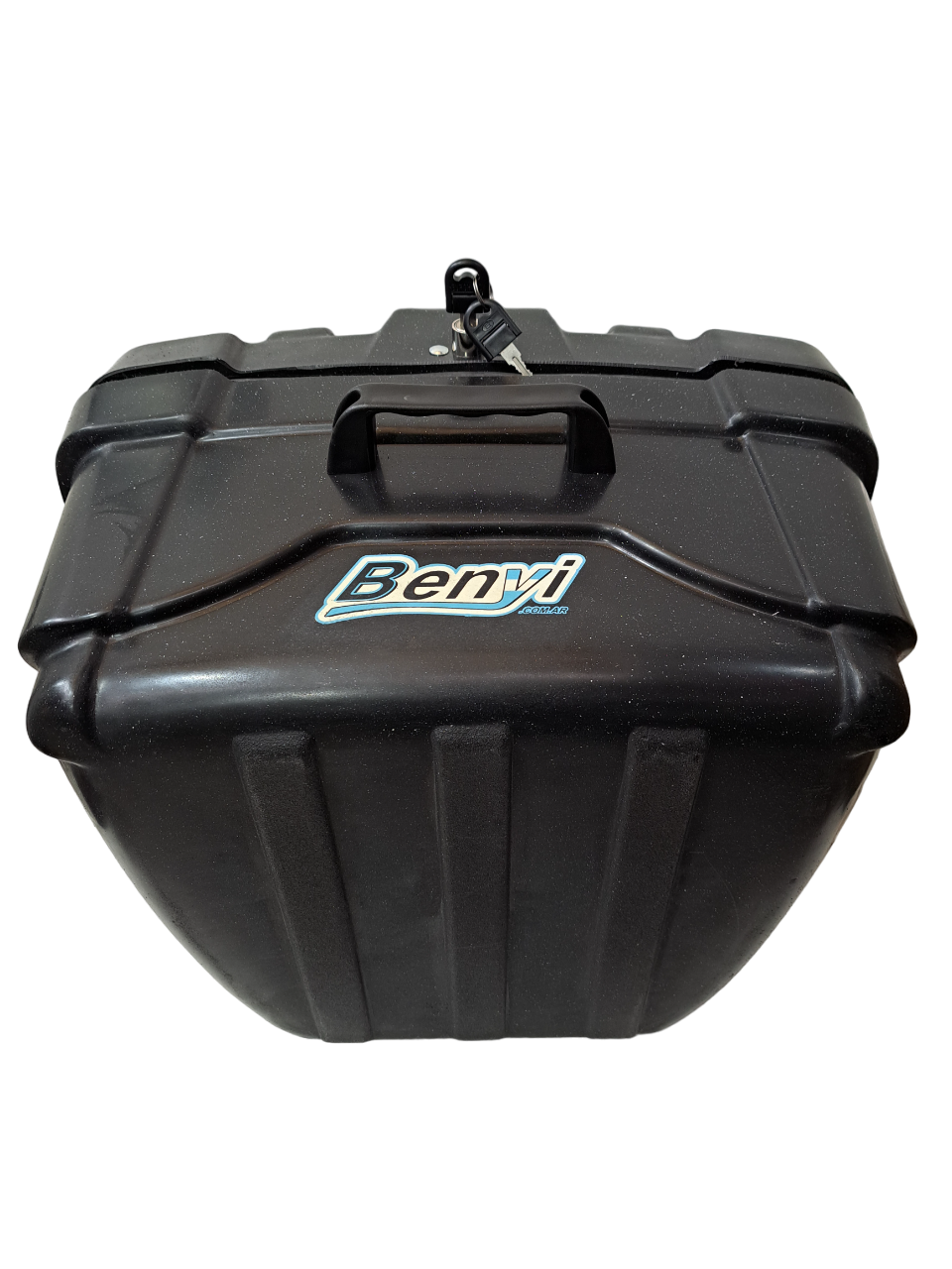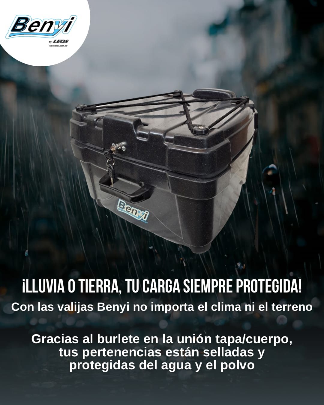 Las Valijas Benyi están fabricadas con polietileno de primera calidad con un espesor de 6mm, generando así la suficiente robustez para resistir todo tipo de uso, incluso golpes y caídas. Vienen equipadas con un sistema de fijación que se adapta a la mayoría de los soportes y el mismo debe ser colocado según cada modelo de portaequipaje. El sistema de cierre es con llave, lo cual brinda un uso cómodo y seguro. Sobre la tapa se puede cargar equipaje y sujetarlo mediante las cuerdas elásticas o bien atarla con sogas desde los 4 puntos de fijación (admite el paso de una soga de hasta 5mm). Sobre la pared trasera se puede adosar un bidón para hasta 5l. En la unión de la tapa con la valija contiene un burlete que asegura un sellado óptimo para el agua y polvo. La disponibilidad de colores es de negro con pintas blancas.