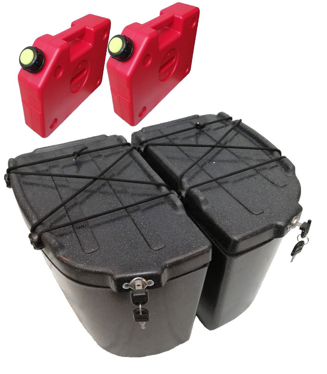 Las Valijas Benyi están fabricadas con polietileno de primera calidad con un espesor de 6mm, generando así la suficiente robustez para resistir todo tipo de uso, incluso golpes y caídas. Vienen equipadas con un sistema de fijación que se adapta a la mayoría de los soportes y el mismo debe ser colocado según cada modelo de portaequipaje. El sistema de cierre es con llave, lo cual brinda un uso cómodo y seguro. Sobre la tapa se puede cargar equipaje y sujetarlo mediante las cuerdas elásticas o bien atarla con sogas desde los 4 puntos de fijación (admite el paso de una soga de hasta 5mm). Sobre la pared trasera se puede adosar un bidón para hasta 5l. En la unión de la tapa con la valija contiene un burlete que asegura un sellado óptimo para el agua y polvo. La disponibilidad de colores es de negro con pintas blancas.